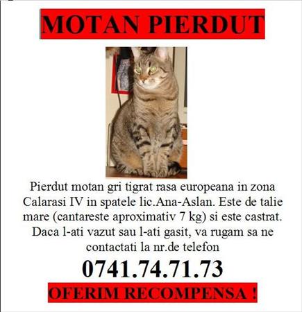 Pierdut motan gri tigrat rasa europeana in BRAILA zona Calarasi IV in spatele lic.Ana-Aslan. Este de talie mare (cantareste aproximativ 7 kg) si este castrat. Daca l-ati vazut sau l-ati gasit, va rugam sa ne contactati la nr.de telefon 0741.74.71.73